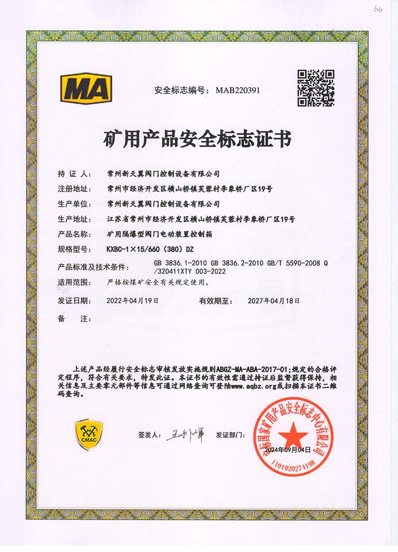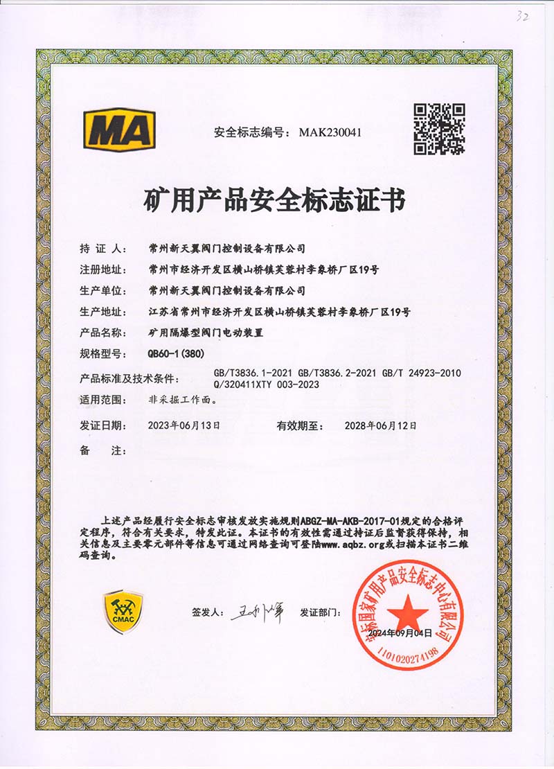 礦用產品安全標志證書QB20-1(380)